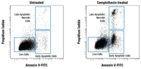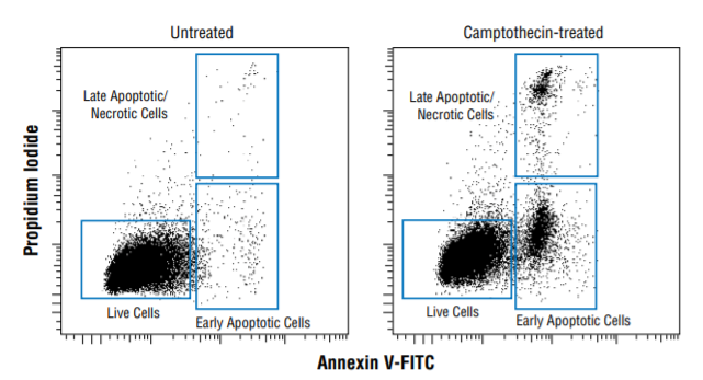 Annexin V-FITC Early Apoptosis Detection Kit 能让研究人员检测某个细胞群的早期凋亡细胞。膜联蛋白 V-FITC 接合蛋白会结合表达磷脂酰丝氨酸(一种早期凋亡标记物)的细胞表面。细胞用碘化丙啶 (PI) 染色,PI 是一种无法渗透细胞的 DNA 染料,能指示坏死细胞。细胞同时用 PI 和膜联蛋白 V-FITC 染色能指示出较晚阶段的凋亡和早期坏死。该试剂盒提供的试剂足以进行 100 次检测(250 μl 检测量)。