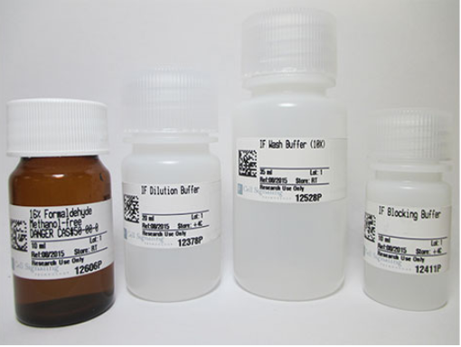 Immunofluorescence Application Solutions Kit 旨在便利地提供对细胞培养物 (IF-IC) 或冷冻样品 (IF-F) 进行免疫荧光分析所需的主要支持试剂。该试剂盒中的试剂已使用我们的 IF 批准抗体充分验证,并且用该试剂盒的建议实验步骤可顺利进行,以确保精确和可重复的结果。该试剂盒包含的试剂足以进行 100 次检测,每次 100 µl 检测量。