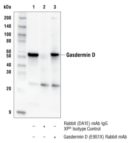 Gasdermin D (E9S1X) Rabbit mAb 可检测 Gasdermin D 总蛋白的内源水平。该抗体可识别在 caspase-1 热解过程中产生的 30 kDa 氨基末端片段。