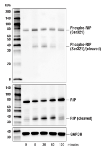 Phospho-RIP (Ser321) (E9K2A) Rabbit mAb 仅在 Ser321 位点被磷酸化时才可识别小鼠 RIP 蛋白的内源水平。