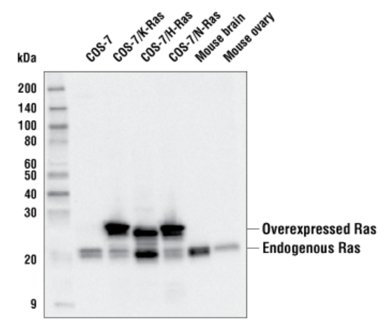 Ras (E8N8L) XP® Rabbit mAb 可检测 K-Ras、H-Ras 和 N-Ras 总蛋白的内源水平。